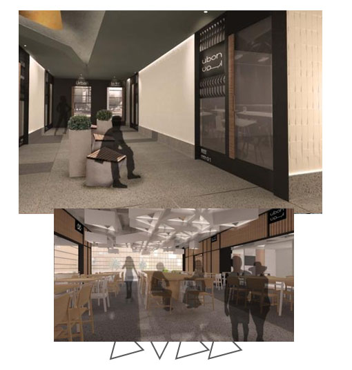 توفر التجـــار منطقتين لتناول الطعام. تقع الأولى في الحـــوش، والثانية في الطابق الأرضي وتسمى بالكشــك. يستضيف الحوش والكشك ستة مساحات ستملأها شركات كويتية. كلا المنطقتين مفتوحة ومتاحة للزوار والمستأجرين. يعتبر الطابق الأرضي مقدمة لما تمثله التجــــار من ابتكار الشباب الكويتي.